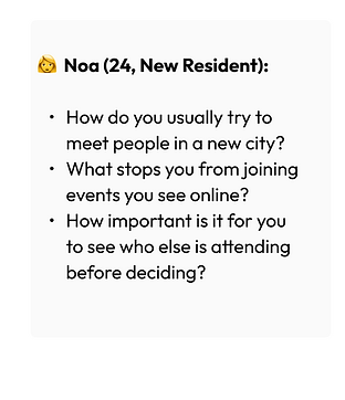 I interviewed 50 neighborhood residents to identify key points, tailoring questions to their backgrounds. I documented and categorized responses, revealing users' needs. This approach allowed me to showcase a diverse range user personas, motivations, barriers, and accessibility in my case study.